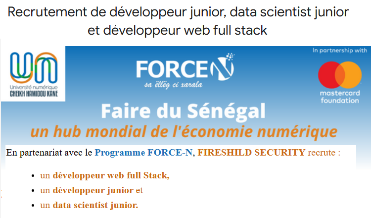En partenariat avec le Programme FORCE-N, FIRESHILD SECURITY recrute un développeur web full Stack, un développeur junior et un data scientist junior.